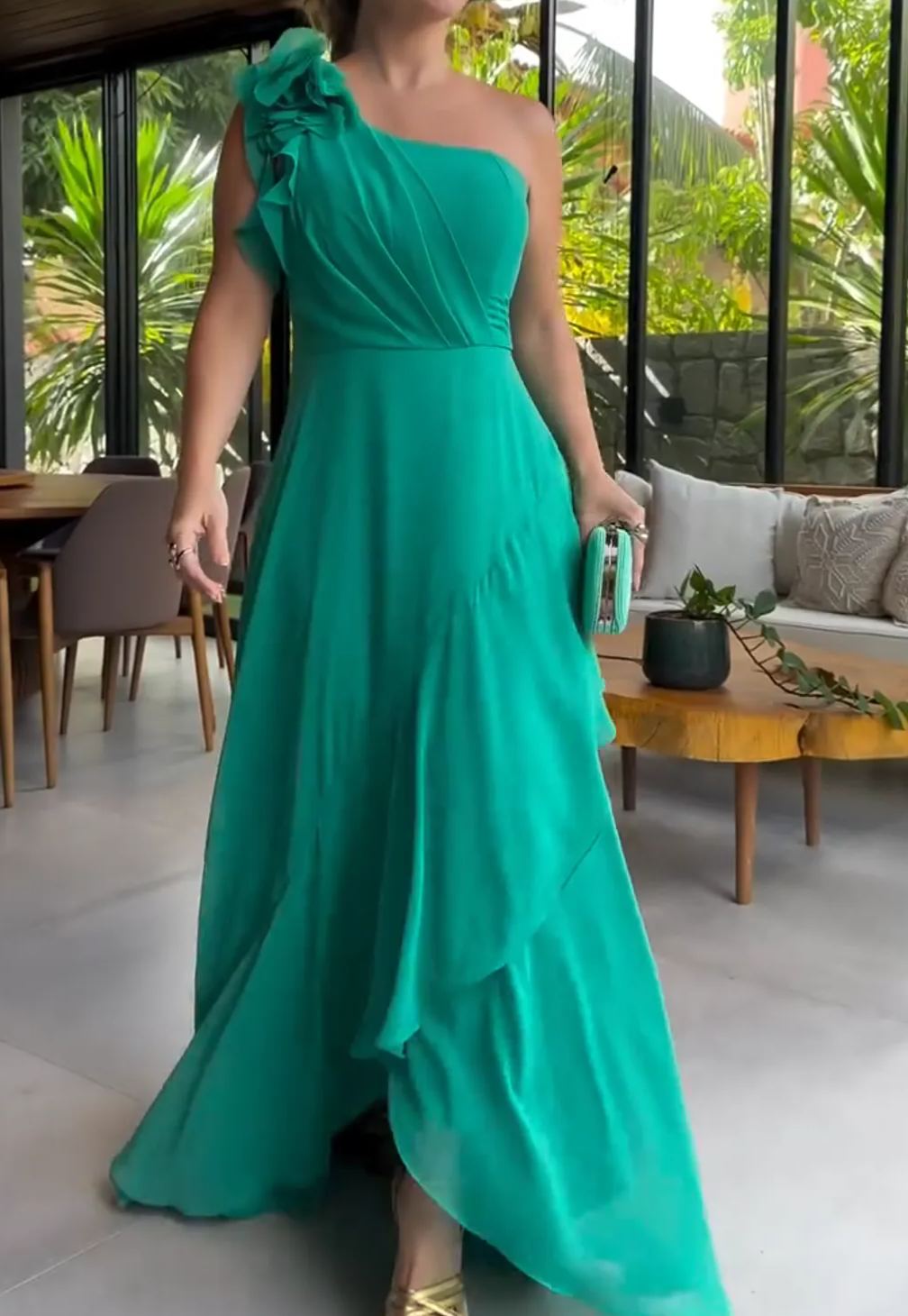 Lujoso vestido con escote en V y volantes