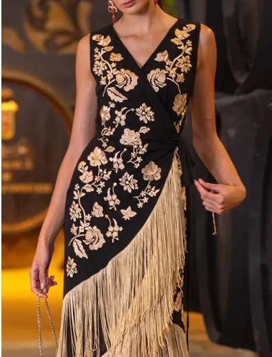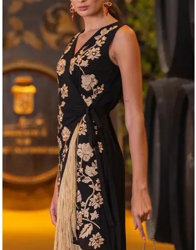 Black Dress with Beige Embroidery and Fringes