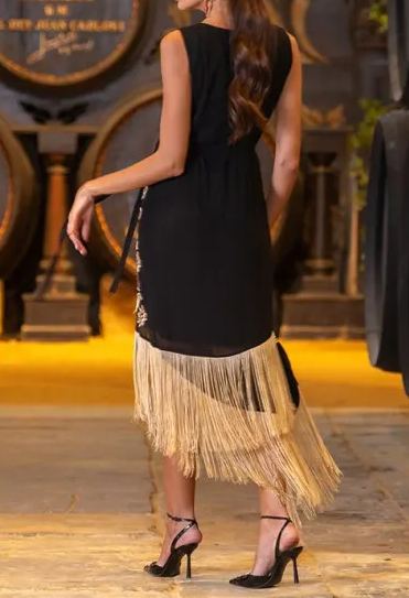 Black Dress with Beige Embroidery and Fringes