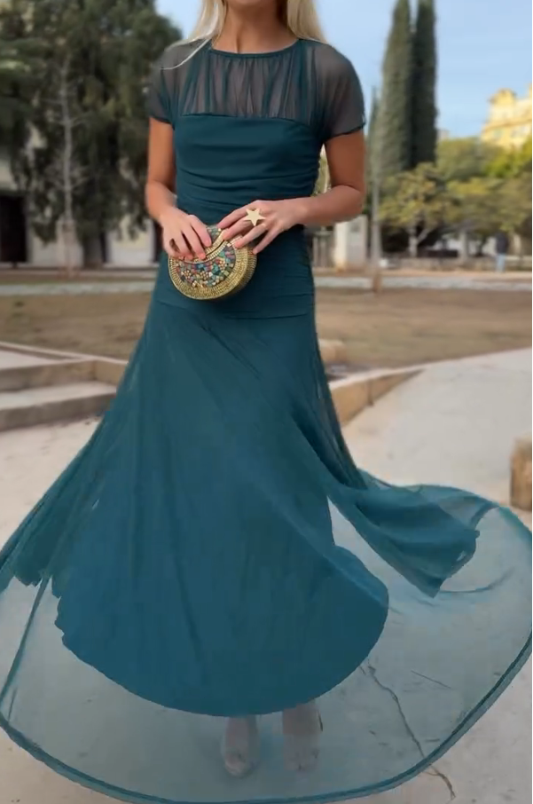 Este impresionante vestido de noche está diseñado para exudar gracia y sofisticación. Con un delicado escote y mangas de malla transparente, el cuerpo fruncido crea una silueta favorecedora que realza tus curvas naturales. La falda fluida se mueve sin esfuerzo, lo que lo convierte en una elección perfecta para ocasiones especiales donde la elegancia se encuentra con la comodidad.