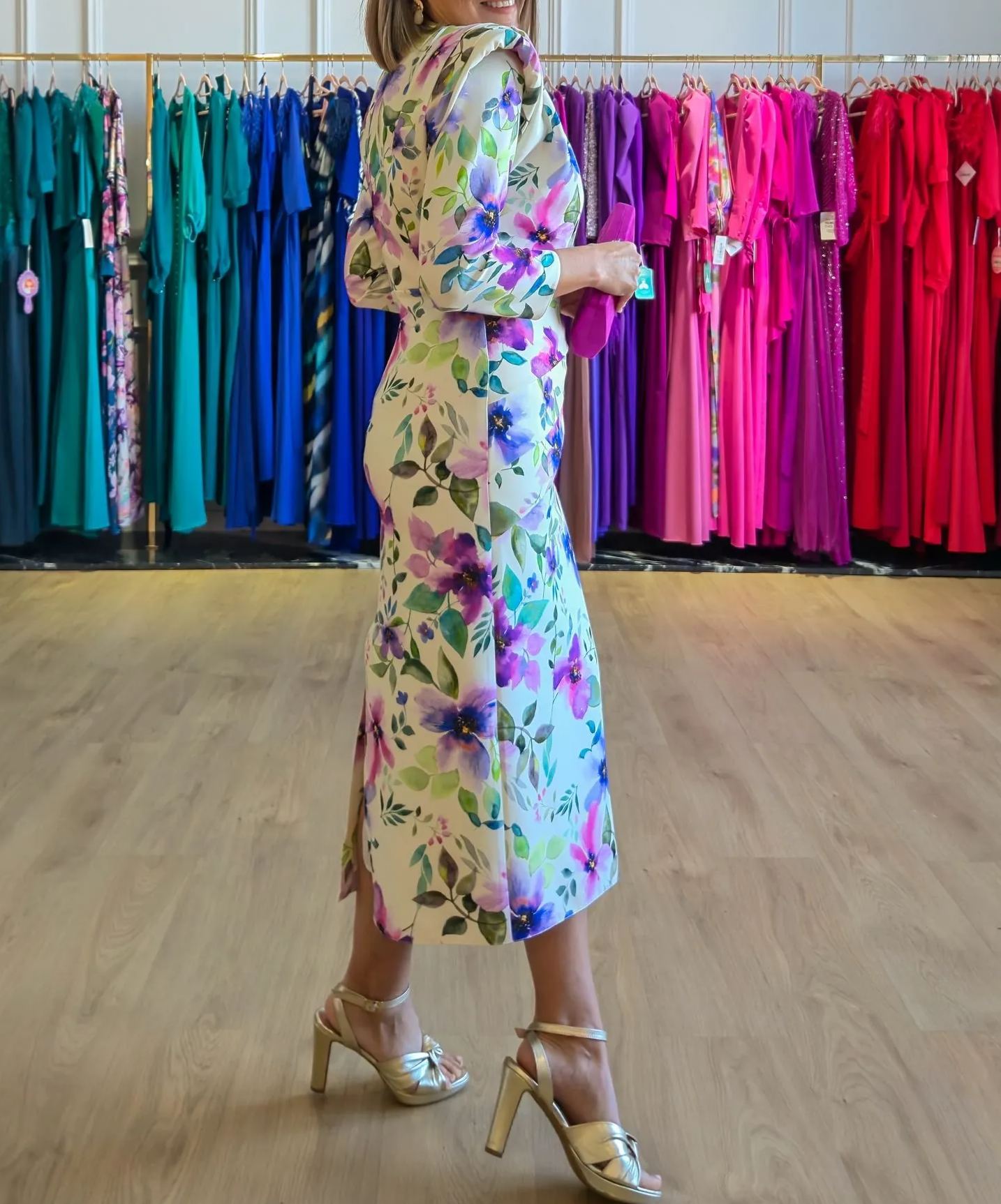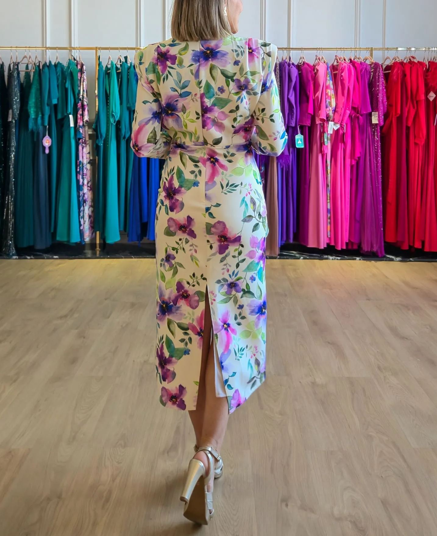 This stunning floral midi dress blends timeless sophistication with a fresh, modern touch. Featuring a wrap-style V-neckline, structured shoulders, and long sleeves, this dress contours your figure beautifully. The vibrant floral print on a soft cream base exudes femininity, while the ruched detailing adds a flattering silhouette. Perfect for any special occasion, this dress ensures effortless elegance.