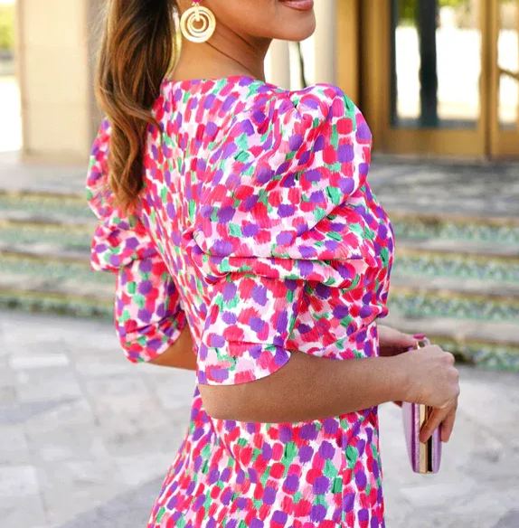 Step into timeless elegance with this stunning puff sleeve printed midi dress. Designed to flatter your silhouette, this dress features a tailored fit with a feminine V-neckline and voluminous puff sleeves for a sophisticated yet playful look. The all-over vibrant print adds a touch of artistic charm, making it perfect for special occasions, brunches, or stylish daytime events. The back slit enhances ease of movement while maintaining an effortlessly chic aesthetic.