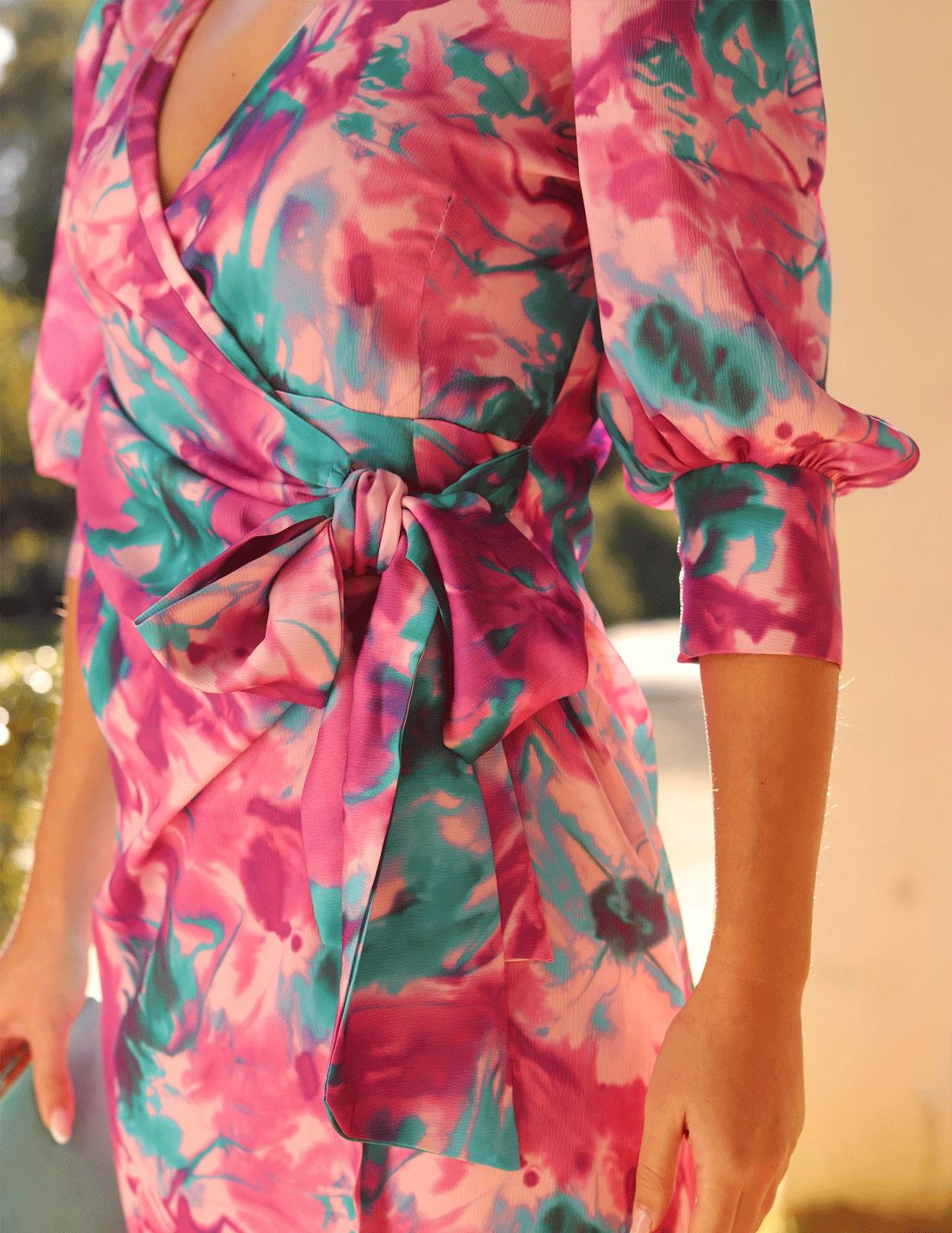 Embrace effortless elegance with this Watercolor Print Wrap Midi Dress, a masterpiece of feminine charm and vibrant hues. Featuring a stunning tie-dye-inspired print in shades of pink and turquoise, this dress is a perfect statement piece for any occasion.